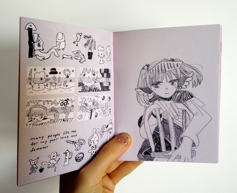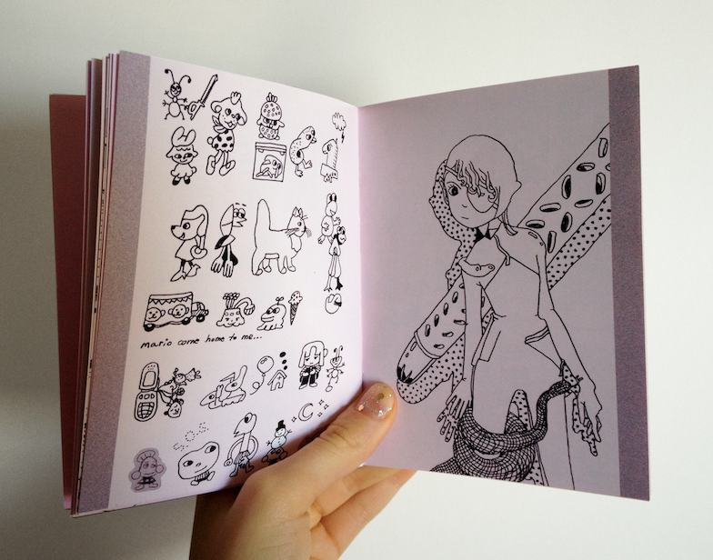 48 page zine (including cover) Printed greyscale on varying shades of pink On 100 lb glossy paper 5.5 by 4.25 inches