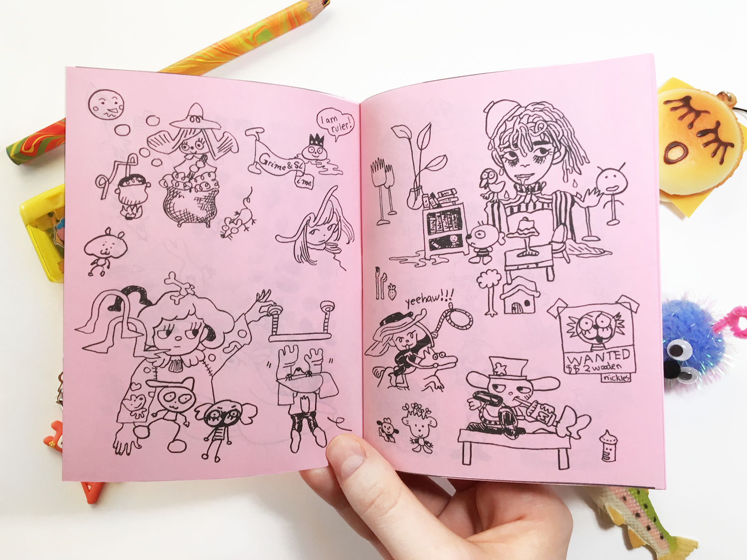 24 page zine Printed black and white on pink paper Collection of drawings by me and Mario