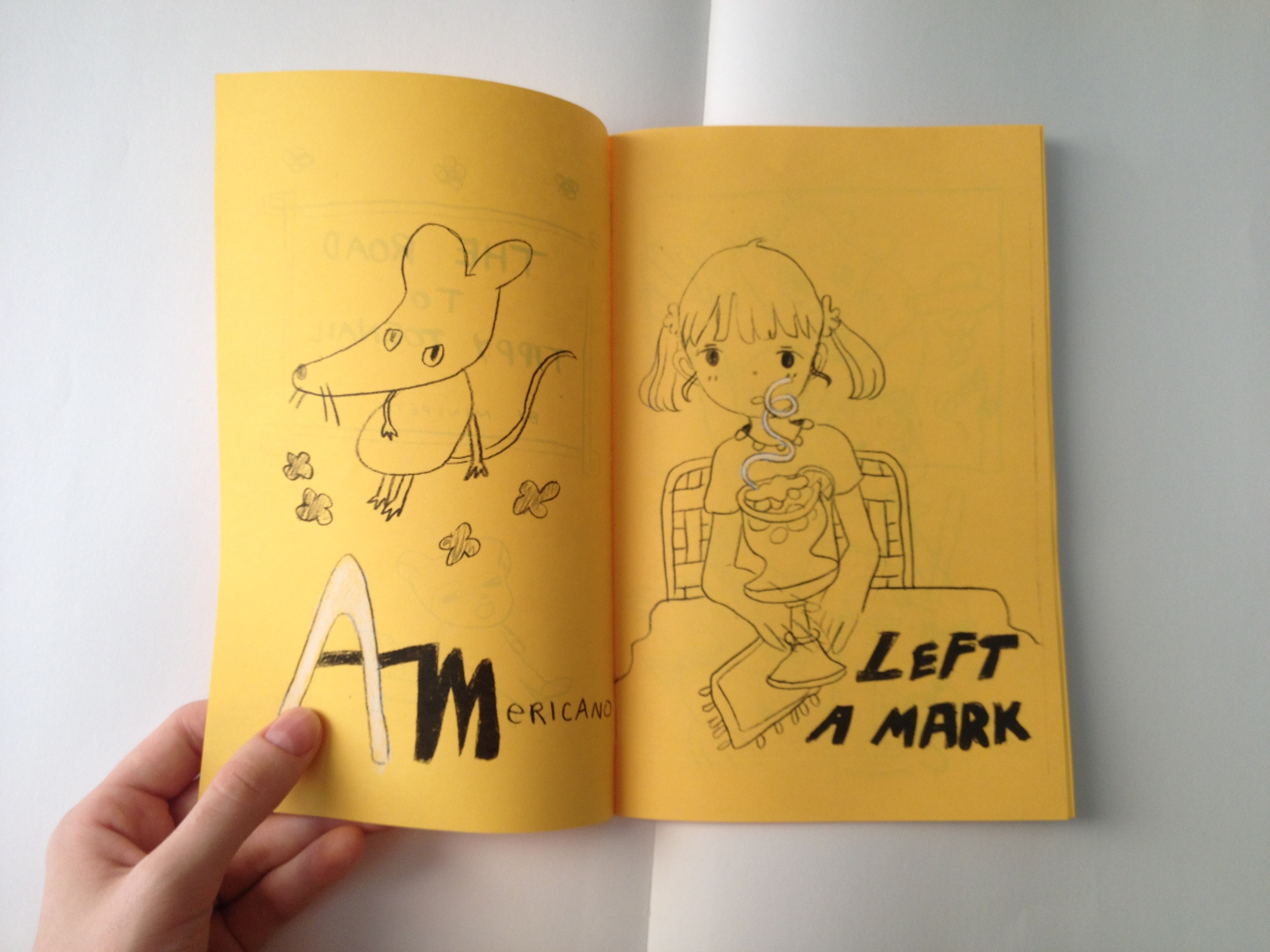 6 page zine Printed black and white on yellow paper Some parts colored in by hand Each copy is slightly different
