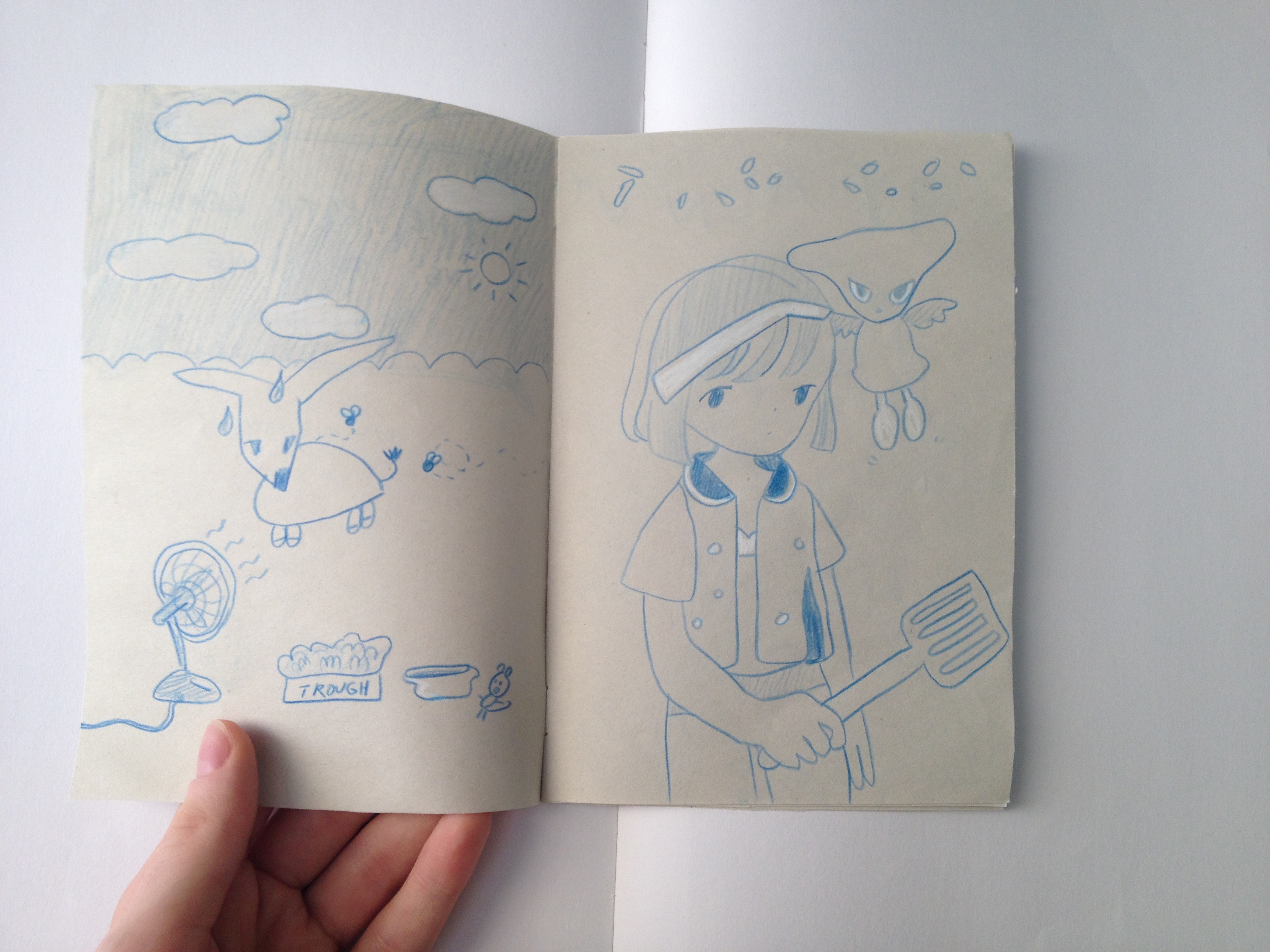 The original hand-drawn zine! 6 pages Blue and white colored pencil on grey paper
