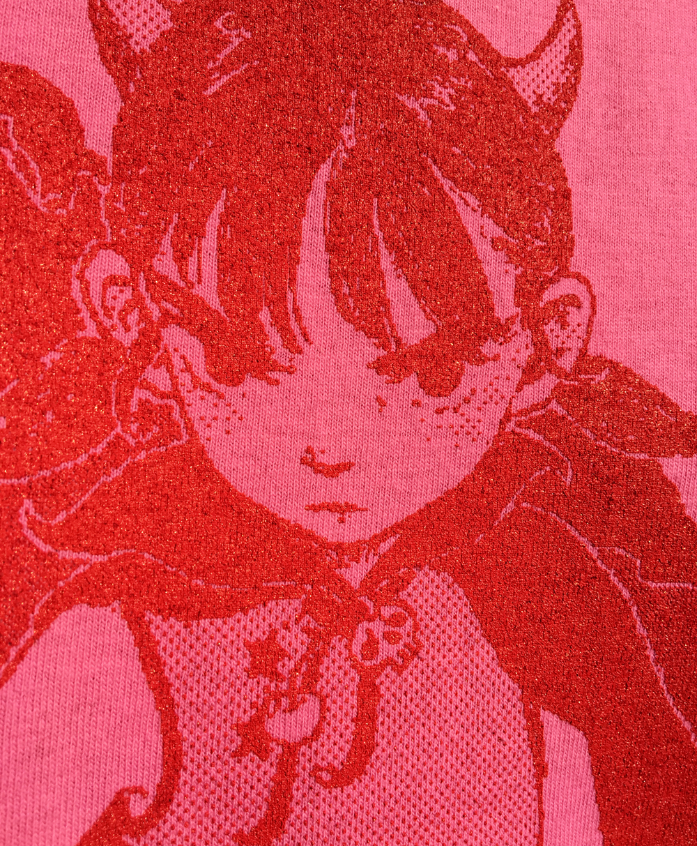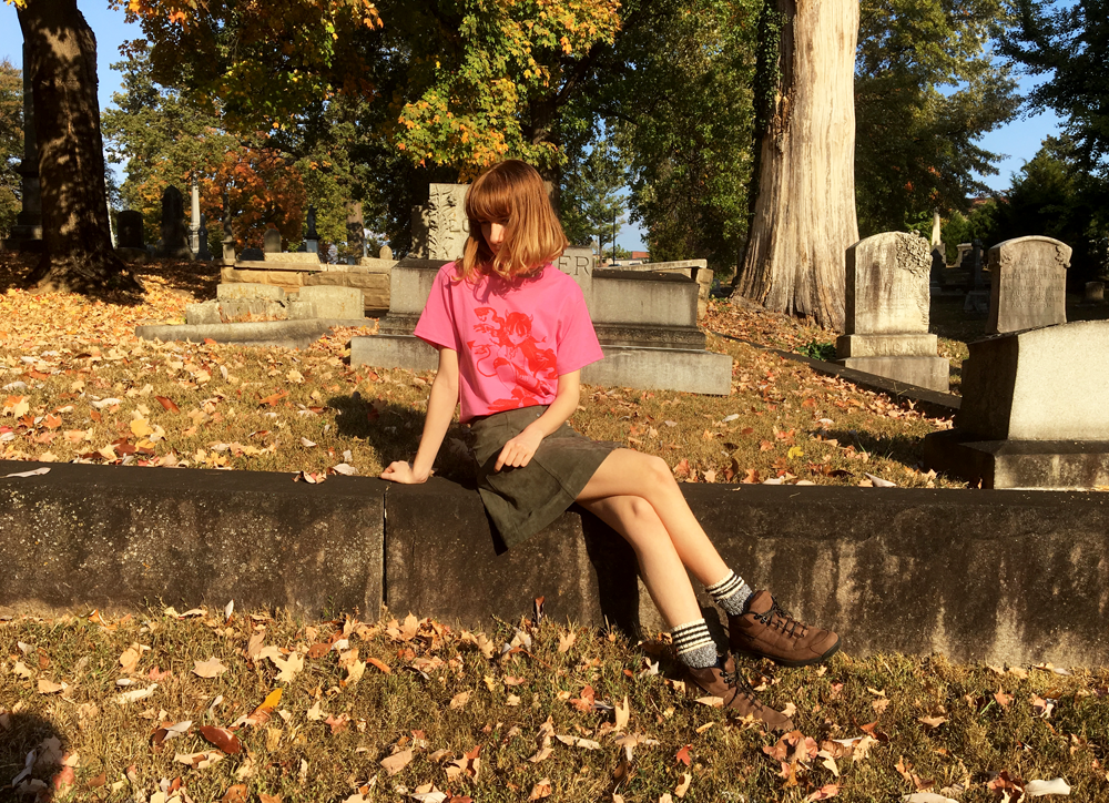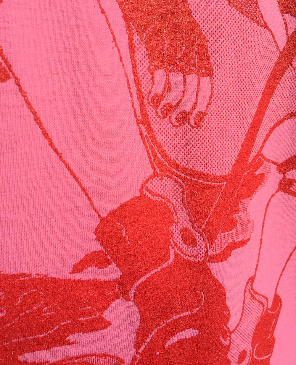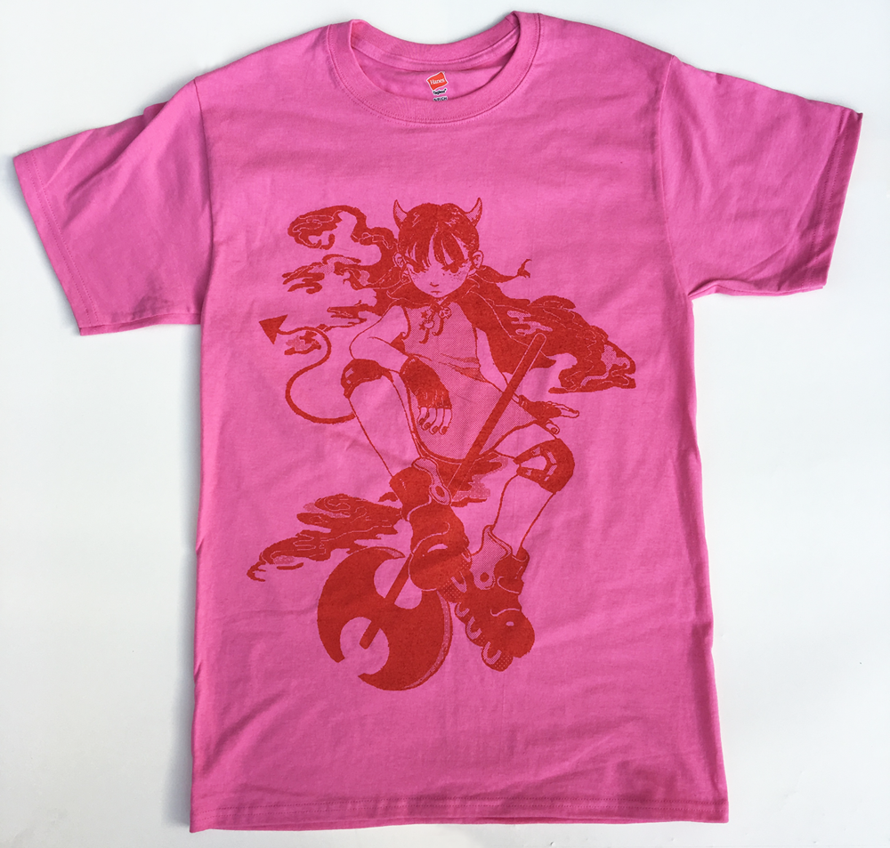 Professionally screen-printed Orange-red ink on pink short sleeved shirt T-shirt brand is Hanes (Tagless)