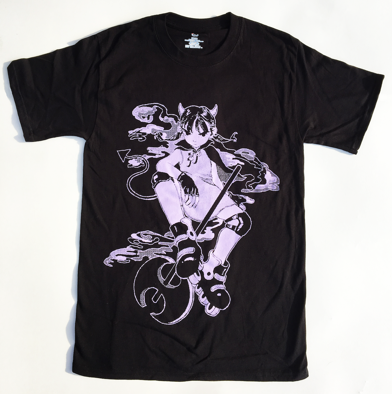*MESSY PRINT* DISCOUNT PRICE Lavendar ink on black short sleeved shirt T-shirt brand is Hanes (Tagless)