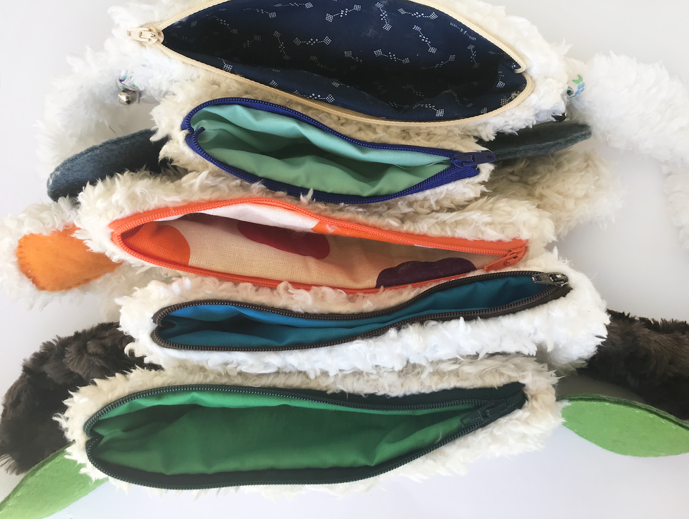 8 x 3.5 inches, white with navy lining, reddish brown zipper